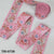 Color: Pink, Orange, Grey, on Pink Viscose Fabric.
