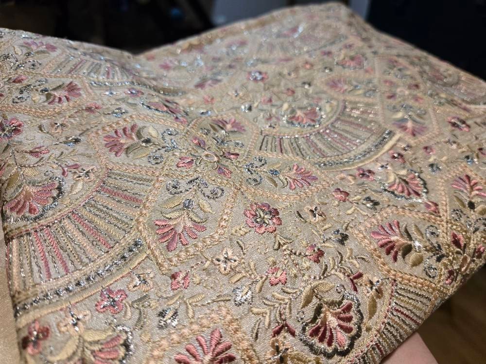 Beige Embroidered Fabric by the yard Sewing DIY Crafting Indian Embroidery Wedding Dress Costumes Dolls Bags Cushion Covers Table Runners Blouses. Indian Embroidered fabric, Cushion Covers Fabric, Pillowcases Fabric, Kids Crafting Fabric, Sewing Fabric, Party Dresses Fabric.