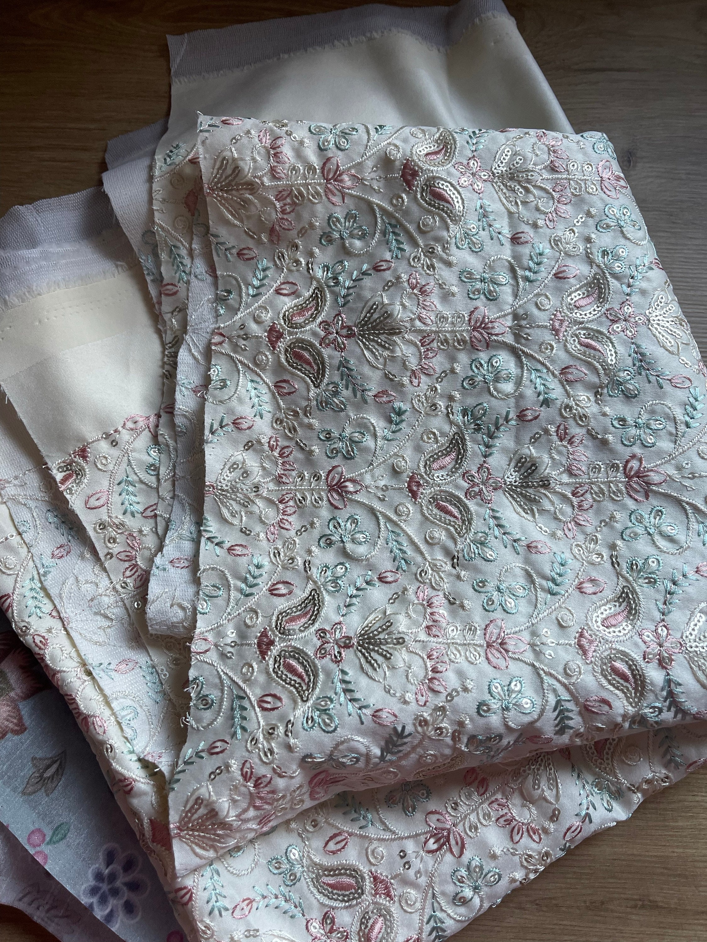 ➤ Color : Peach, Beige, Green, Cream on Ivory Cambric Cotton Fabric.