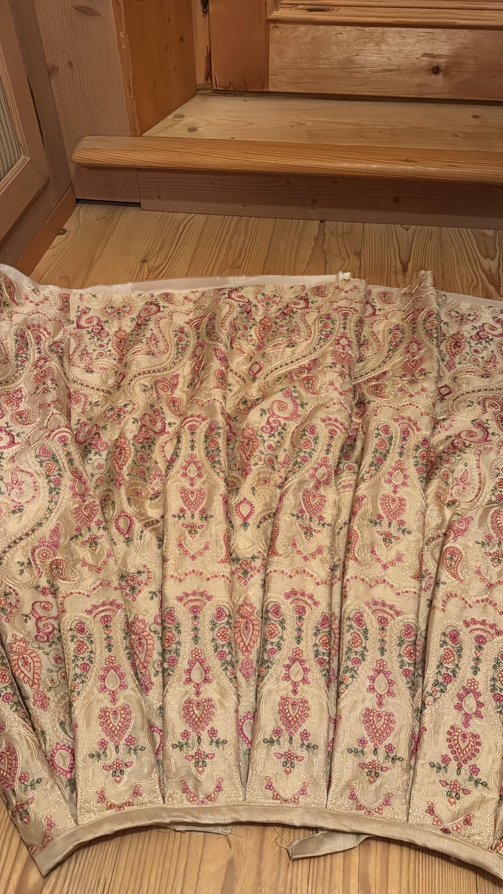 ➤ Color: Pink, Peach, Orange, Magenta, Green Embroidery on Natural color Pure Tussar Silk Fabric.