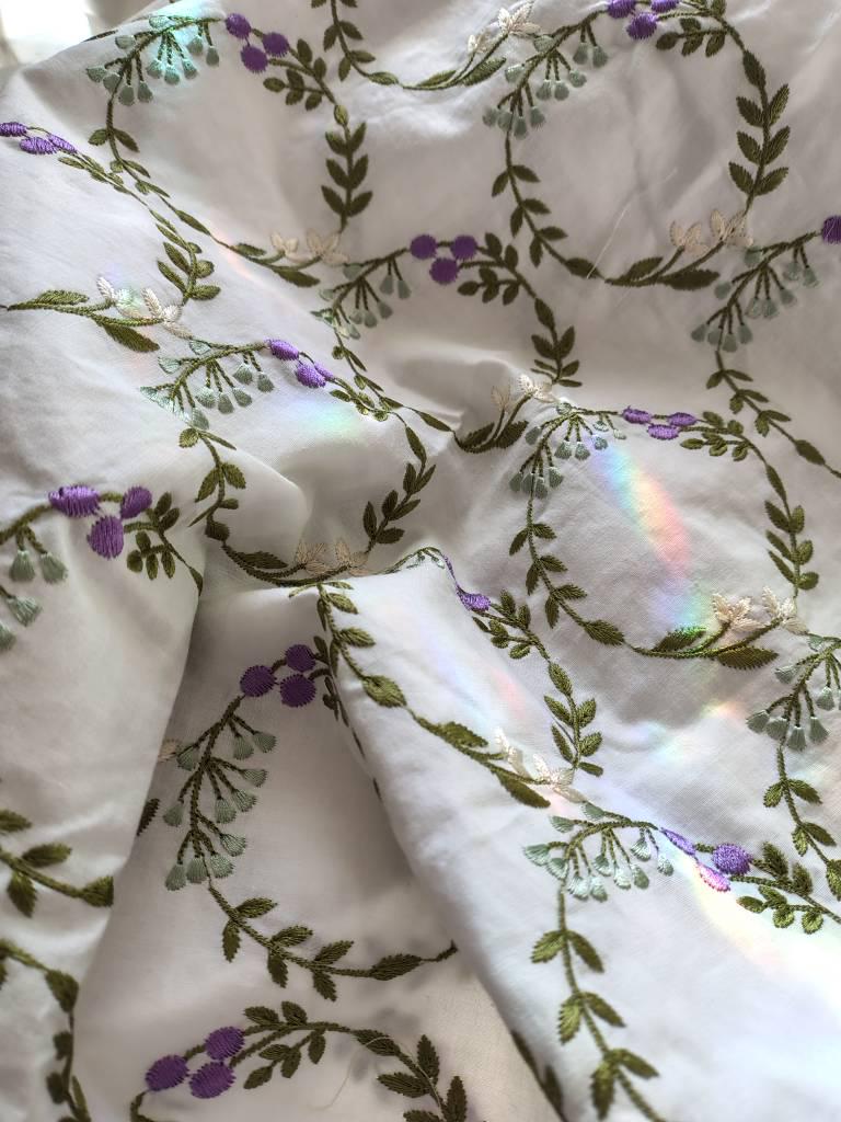 ➤ Color: Olive Green, Pista, Lavender and Ivory Embroidery on Off White Cambric Cotton Fabric.