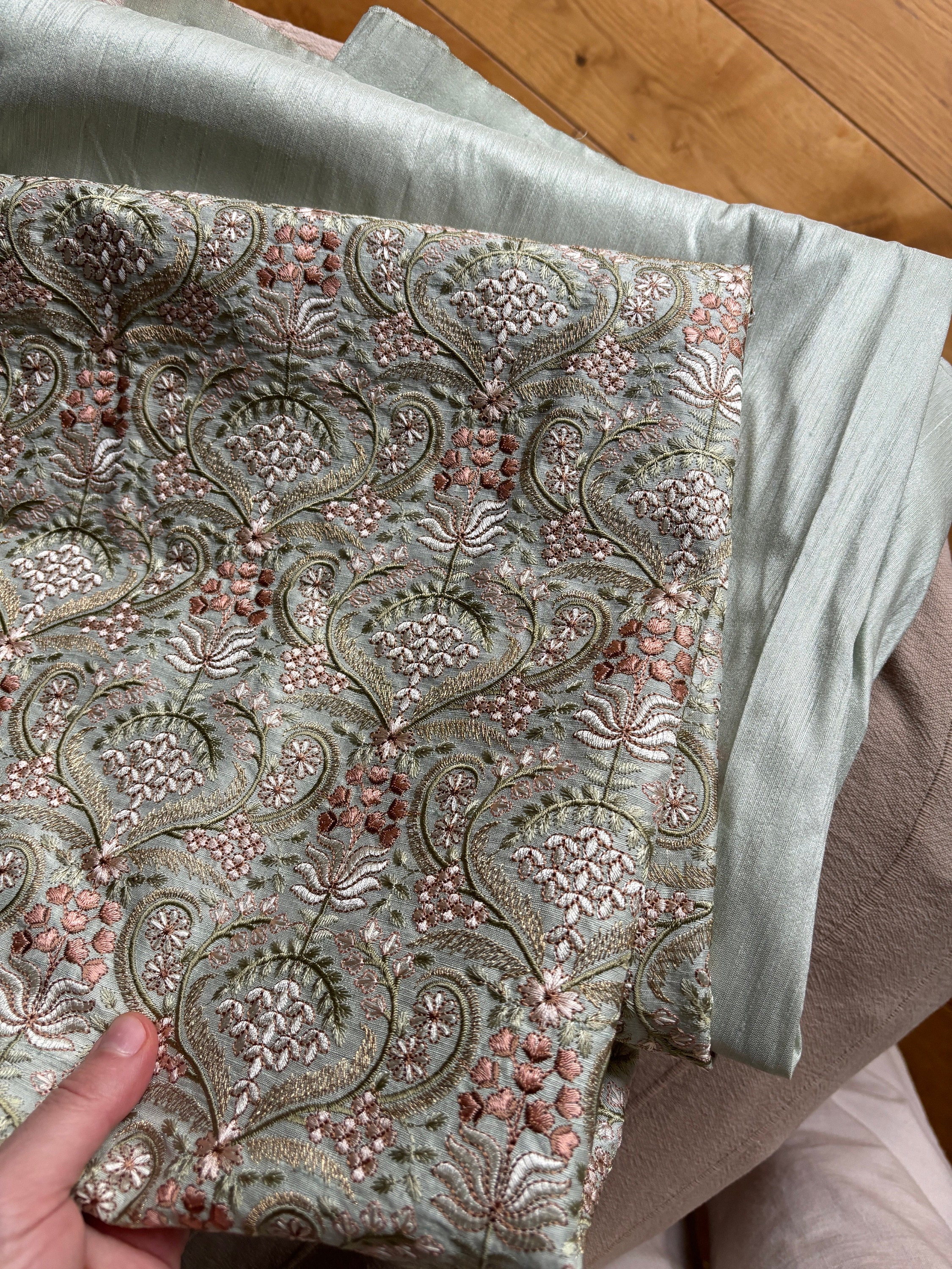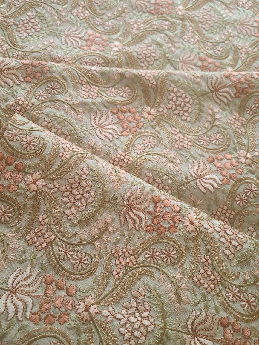 ➤ Color: Peach, Ivory, Pista Green, Beige, Ivory on Pistachio Green Viscose Dupioni Fabric.