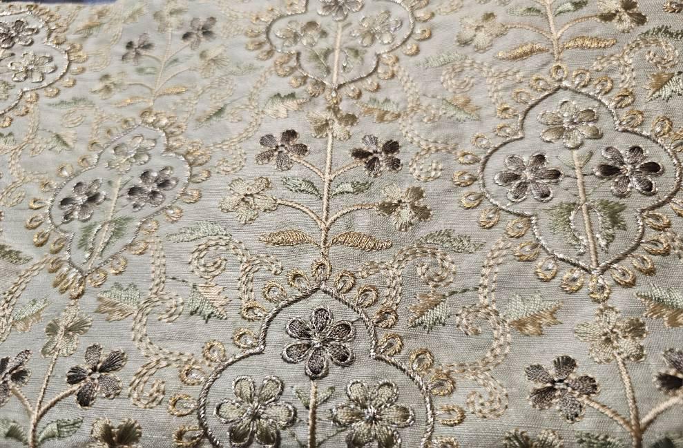➤ Color: Beige, Pistachio Green, Moss Green, Silver Zari and Gold Zari Embroidery on Pista Viscose Dupioni Fabric.